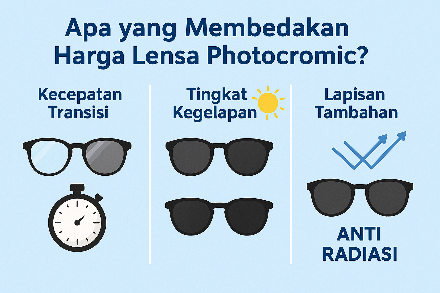 Dengan harga mulai dari Rp 185.000, Anda sudah bisa mendapatkan kacamata 2-in-1 yang sangat praktis. Jangan lupa untuk merawat lensa photocromic Anda dengan benar agar awet!